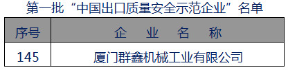 “中国出口质量安全示范企业”是国家质检总局为促进出口产品质量安全水平提升,培育出口竞争新优势,根据《中国出口质量安全示范企业创建工作规范(试行)》(国质检检〔2014〕575号)规定,经各省直属检验检疫局评估推荐、质检总局审核并向社会公示授予的出口企业质量最高荣誉。
